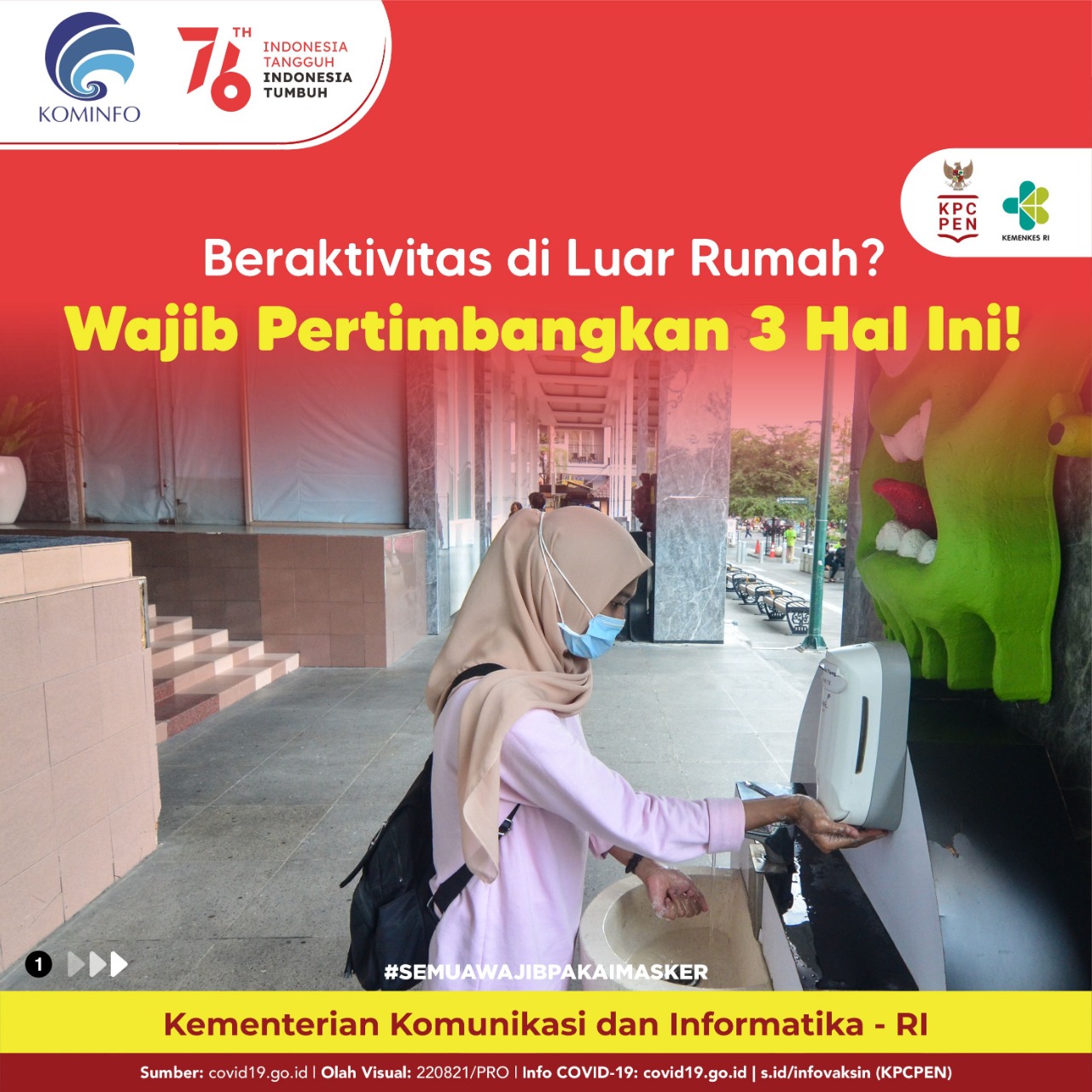 Baiknya, sebelum memutuskan untuk beraktivitas di luar rumah, pertimbangkan hal-hal seperti berjumpa dengan siapa dan berapa banyak orang yang mungkin papasan dengan kita selama perjalanan, serta di mana lokasi jumpa, juga berapa lama aktivitasnya akan berlangsung.