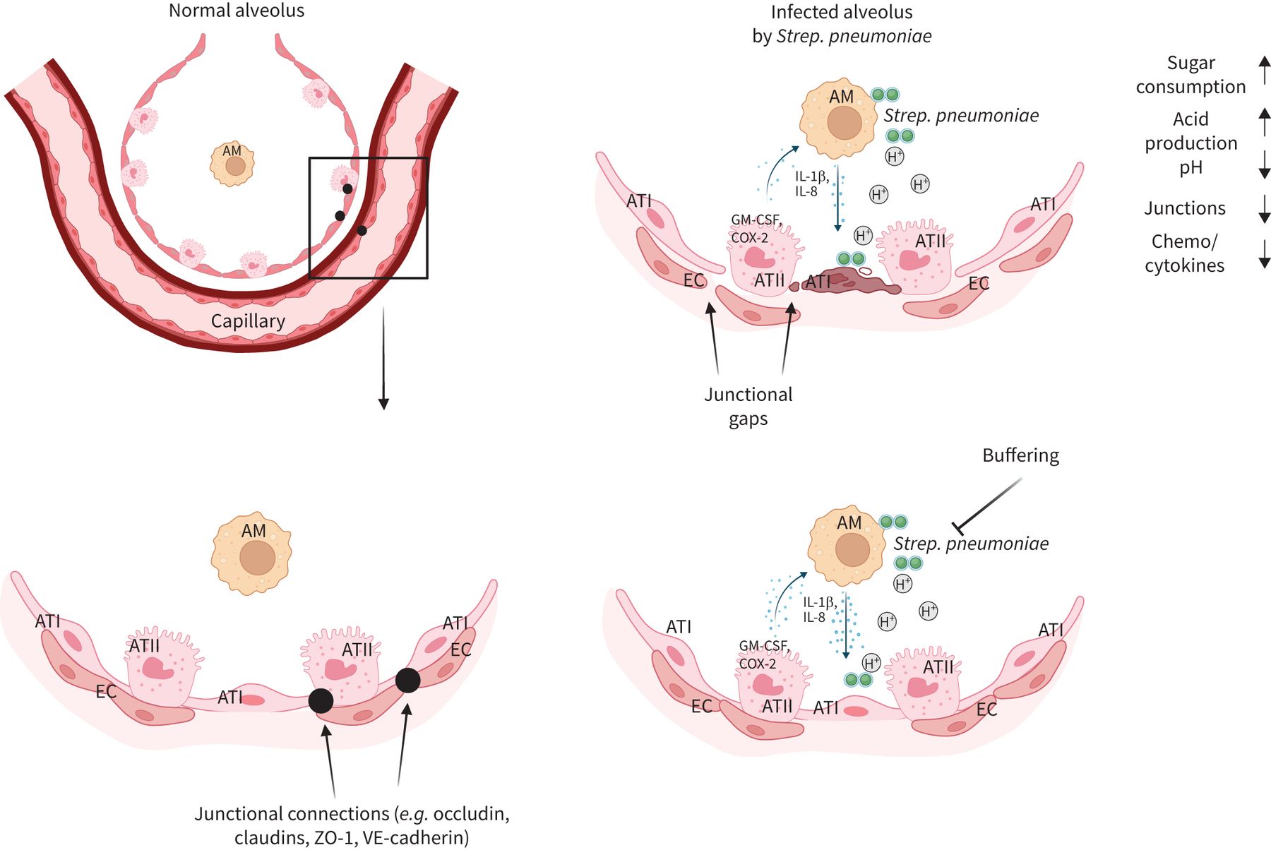 Streptococcus pneumoniae is the most common causative agent of community-acquired pneumonia worldwide. A key pathogenic mechanism that exacerbates severity of disease is the disruption of the alveolar–capillary barrier. However, the specific virulence mechanisms responsible for this in the human lung are not yet fully understood. In this study, we infected living human lung tissue with Strep. pneumoniae and observed a significant degradation of the central junctional proteins occludin and vascular endothelial cadherin, indicating barrier disruption. Surprisingly, neither pneumolysin, bacterial hydrogen peroxide nor pro-inflammatory activation were sufficient to cause this junctional degradation. Instead, pneumococcal infection led to a significant decrease of pH (?6), resulting in the acidification of the alveolar microenvironment, which was linked to junctional degradation. Stabilising the pH at physiological levels during infection reversed this effect, even in a therapeutic-like approach. Further analysis of bacterial metabolites and RNA sequencing revealed that sugar consumption and subsequent lactate production were the major factors contributing to bacterially induced alveolar acidification, which also hindered the release of critical immune factors. Our findings highlight bacterial metabolite-induced acidification as an independent virulence mechanism for barrier disruption and inflammatory dysregulation in pneumonia. Thus, our data suggest that strictly monitoring and buffering alveolar pH during infections caused by fermentative bacteria could serve as an adjunctive therapeutic strategy for sustaining barrier integrity and immune response.