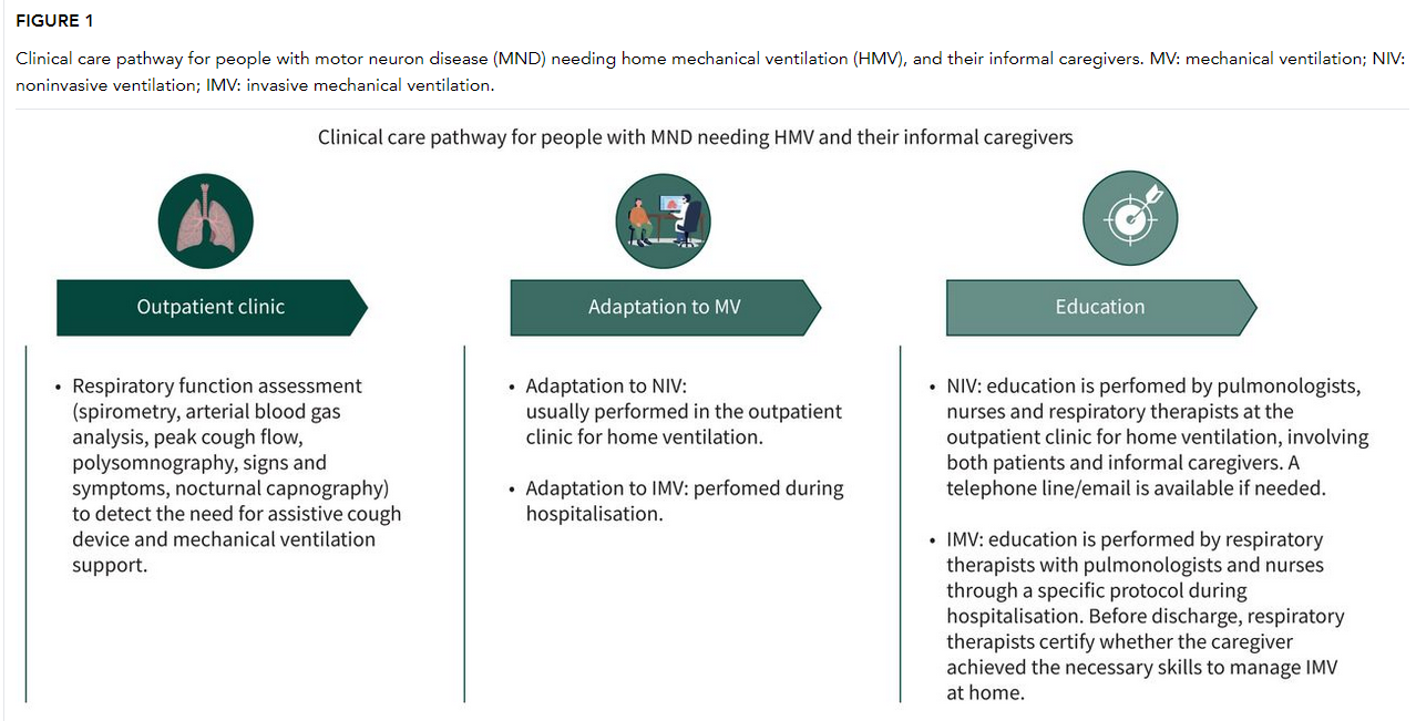 Respiratory failure represents the leading cause of death among people with motor neuron disease (MND). Home mechanical ventilation supports respiratory function, but its management places a significant demand on patients and informal caregivers. The need for consistent support to deal with home mechanical ventilation is recognised. Regardless, specific educational interventions are infrequently reported. Within its multidisciplinary clinical care pathway, the Regional Expert Centre for MND of a Northern Italy university hospital offers patients and their caregivers an educational programme on how to deal with noninvasive ventilation (NIV) and invasive mechanical ventilation (IMV) at home.