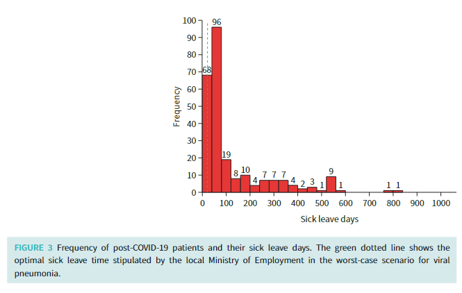 A total of 248 patients were included. The median sick leave time for the entire population was 53 days (interquartile range (IQR) 37.0–126.5), global sum of 30 169 days; the median optimal sick leave time was 21.9 days (IQR 19.7–25.9) (p<0.05). The third tertile cut-off point for LSL was 83 days and multivariate analysis showed a significant association with dyspnoea (OR 3.26, 95% CI 1.59–6.70, p=0.0001), while physical exercise of at least 10 min·day−1 was significantly associated with shorter sick leave durations (OR 0.45, 95% CI 0.20–0.98, p=0.04).