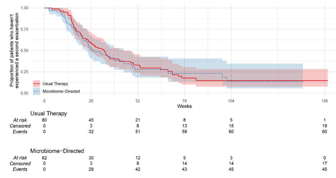 149 participants had an eligible exacerbation (usual-therapy n=83, microbiome-directed therapy n=66). There was no difference between the groups for ppFEV1 at day 14 (−1.1%, 95%CI −3.9 to 1.7; p=0.46), or ppFEV1 measured at other time-points, or for time-to-next exacerbation (microbiome-directed versus usual-therapy Hazard Ratio 0.91 [95%CI 0.60 to 1.38; p=0.66]). The microbiome-directed group trended to have more IV days (median 42 versus 28; p=0.08) and more subsequent exacerbations (median 3 versus 2; p=0.044) the following year. There were no appreciable differences in symptom burden; however, HRQoL sub-scores were consistently worse in the microbiome-directed group (−4.3 points versus usual therapy (95%CI −8.3 to −0.3, p=0.033).