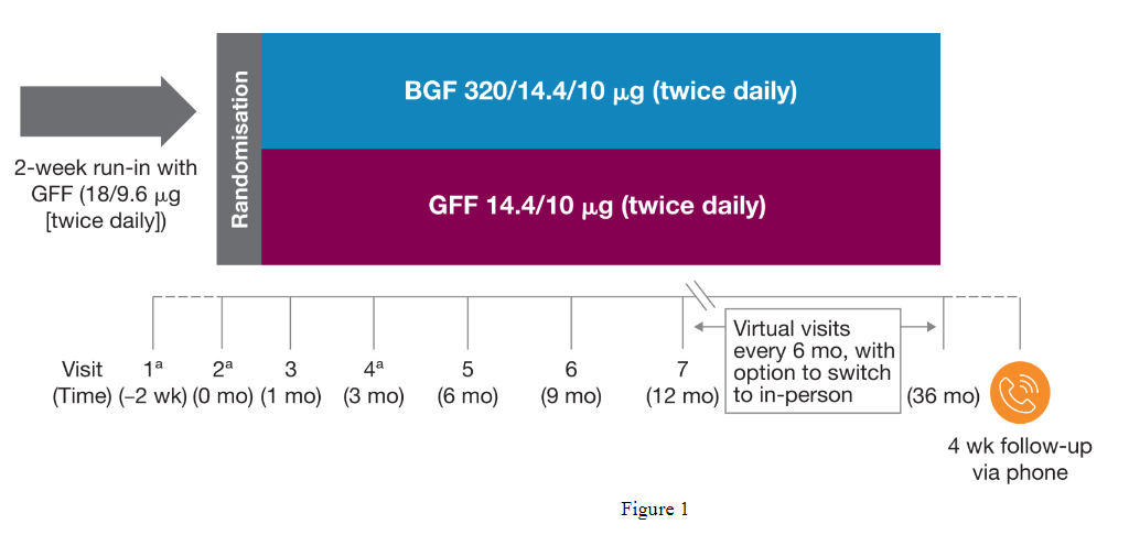 This first-of-its-kind cardiopulmonary outcomes trial will determine the effect of BGF on a novel composite endpoint comprising severe cardiopulmonary events in a broad COPD population with elevated cardiopulmonary risk not currently using ICS-containing maintenance therapy (see supplement for plain language summary infographic).