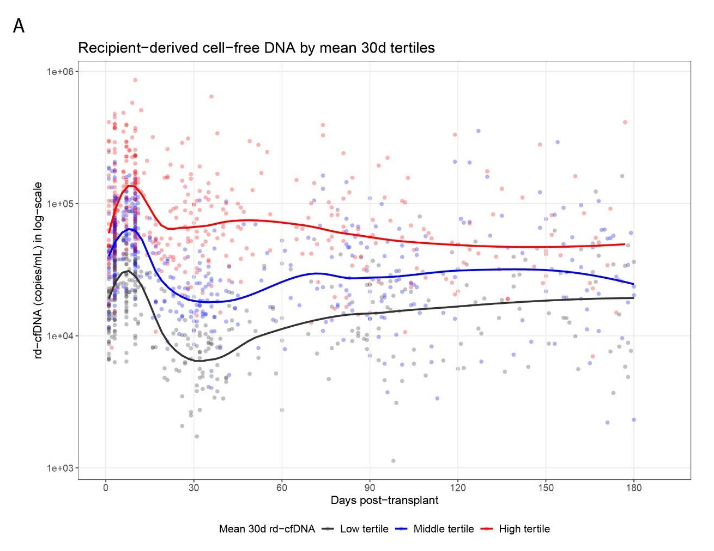 The study included 215 patients with 2530 cfDNA values, including 675 cfDNA assessments in the first 30 days. Median rd-cfDNA levels in the first 30 days post-transplant were ∼16-fold higher than cfDNA for healthy controls. Patients in the highest tertile rd-cfDNA group had lower lung function post-transplant, and increased risk of death (HR: 3.15, 95% CI: 1.59–6.24, p<0.001) and acute rejection (HR 2.33, 95% CI: 1.33–4.08, p=0.03), compared to the low/middle tertile group. Tissue-specific cfDNA sources were also distinct cfDNA in the highest versus lowest rd-cfDNA tertiles, with cfDNA from innate immune cells serving as the strongest predictor of mortality.