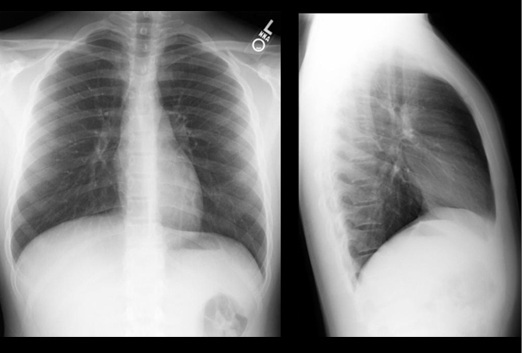 Sebuah rontgen pada dada, mengambil gambar dari jantung, paru, pembuluh darah, saluran pernafasan, dan kelenjar getah bening di daerah ini. Tulang dada, tulang rusuk, dan tulang selangka juga masuk dalam gambar. Gambar ini juga menunjukkan bagian atas tulang belakang. Rontgen dada digunakan untuk mendiagnosis masalah kesehatan yang menimbulkan gejala di daerah dada seperti masalah paru dan pernafasan serta gangguan jantung. Pada kebanyakan kasus, rontgen dada melibatkan dua gambar, yaitu gambar yang diambil dari belakang, dan satu lagi diambil dari samping.