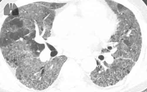On day-10, because the patient still required high levels of oxygen via high-flow nasal cannula, a control CTPA was performed. It showed no evidence of pulmonary embolism, but rapid onset of extensive pulmonary honeycombing fibrosis in the territories where ground glass opacities had been present. Multidisciplinary meeting concluded that rapid onset pulmonary fibrosis complicated the course of severe Covid-19 pneumonia. Search for other causes of interstitial lung disease including autoimmune disease was negative. Treatment included daily high-dose intravenous corticosteroids boluses of 250 milligrams for three days, followed by 1 milligram per kilogram per day, associated with antifibrotic therapy with nintedanib. The patient's condition improved and he was transferred to pneumology wards on day 18 on oxygen therapy (6 L·min−1).