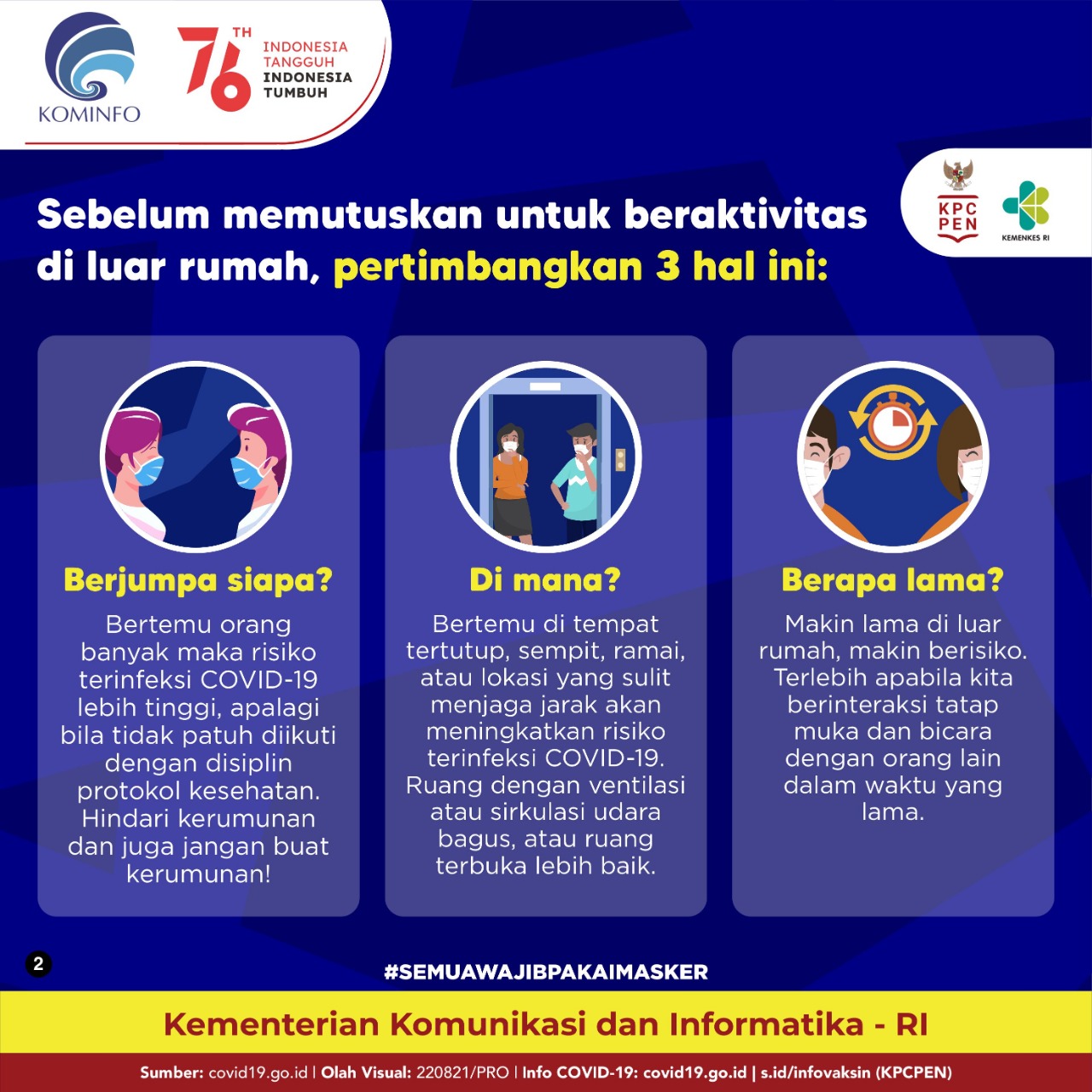 Baiknya, sebelum memutuskan untuk beraktivitas di luar rumah, pertimbangkan hal-hal seperti berjumpa dengan siapa dan berapa banyak orang yang mungkin papasan dengan kita selama perjalanan, serta di mana lokasi jumpa, juga berapa lama aktivitasnya akan berlangsung.