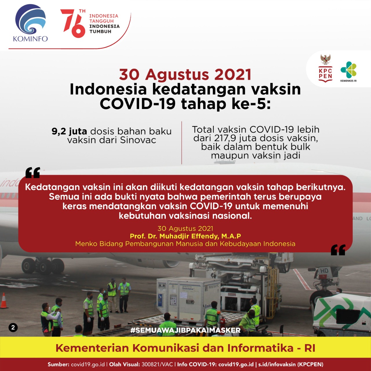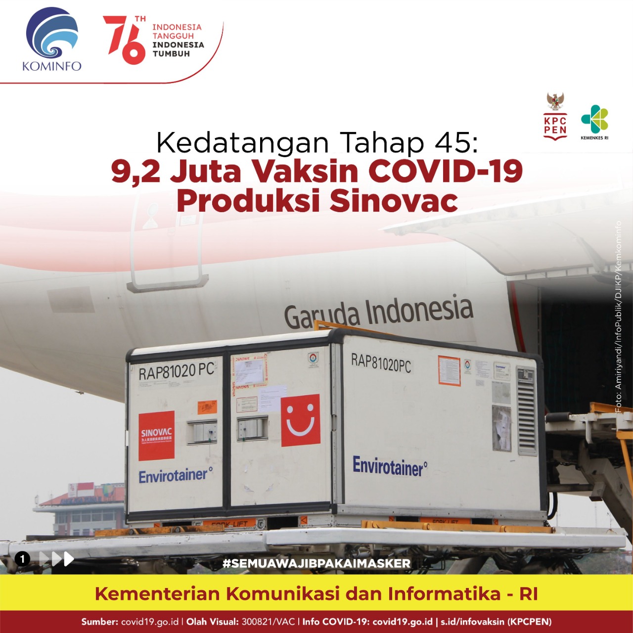 Pada 30 Agustus 2021, Indonesia kedatangan vaksin COVID-19 tahap ke-45 sebanyak 9,2 juta dosis bahan baku (bulk) vaksin dari Sinovac.