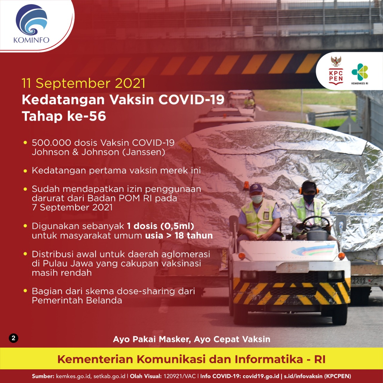 Indonesia terima kedatangan vaksin COVID-19 merek Johnson & Johnson yang dikembangkan oleh Janssen Pharmaceutical Companies untuk pertama kalinya pada 11 September 2021.