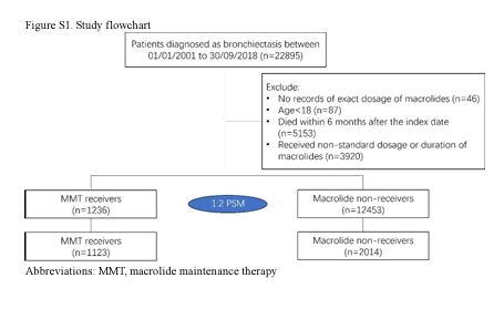 This territory-wide cohort study analyzed patients diagnosed with bronchiectasis in Hong Kong between 2001 and 2018. Patients were classified as MMT receivers or macrolide non-receivers based on the administration of MMT. Propensity score (PS) matching was employed for confounding factors adjustment. The primary outcome of interest was major adverse cardiovascular events (MACE), a composite of cardiovascular death, myocardial infarction and stroke. The safety outcome was the occurrence of ventricular arrhythmias or sudden cardiac death. Cox proportional hazard regression analysis was utilized to compare the incidence of outcomes across the two groups.