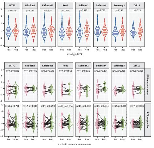 Cross-sectional analysis of baseline gene expression data from HIV-uninfected participants revealed no differences in Z-scores between Mtb DNA-positive versus Mtb DNA-negative participants for any of the eight signatures investigated (figure 1a). Prospective analyses comparing expression of the same eight signatures in HIV-infected participants before versus after administration of IPT showed no change in gene expression Z-scores over the course of treatment, either for those in whom Mtb DNA was undetectable at follow-up (“PCR responders”) or for those in whom Mtb DNA was still detected at follow-up (“PCR non-responders”) (figure 1b).