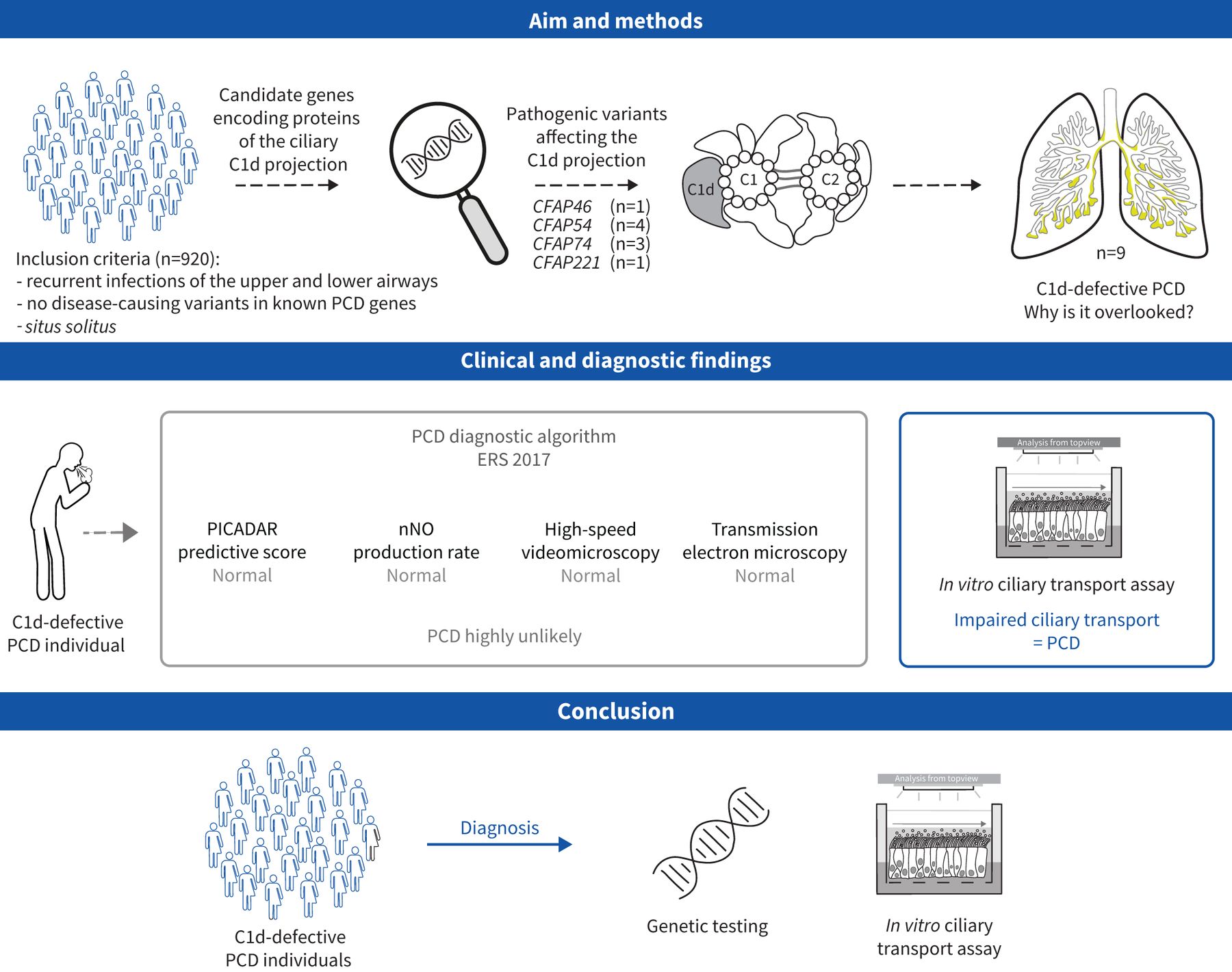 Overall, this study extends the spectrum of primary ciliary dyskinesia genes and highlights that individuals with C1d-defective primary ciliary dyskinesia elude diagnosis when using the current diagnostic algorithm. To enable diagnosis, genetic testing should be prioritised in future diagnostic guidelines.