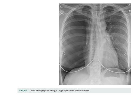 Her chest radiograph (CXR) on presentation showed a large right-sided pneumothorax (figure 1). She had a normal pulse, blood pressure, respiratory rate and oxygen saturations on air at rest. However, simple exertion such as walking a few steps made her very breathless. As per established local guidance, she was offered the choice between conservative management, admission with chest drain insertion or ambulatory management with either a 12 French gauge (FG) Seldinger chest drain (which would be connected to an ambulatory bag) or an 8FG Rocket Pleural Vent. Northumbria Healthcare NHS Trust has a well-established ambulatory pneumothorax service [1]. The ambulatory devices are inserted by Accident and Emergency Department practitioners and the subsequent management takes place on the Medical Ambulatory Care unit by acute medicine physicians, with the respiratory team getting involved in case of complications or non-resolution. With the premise that this was a primary pneumothorax (as the patient had no apparent lung disease), and because the priority of the patient was admission avoidance, she was seen by the pleural team and ambulatory management was initiated with an 8FG Rocket Pleural Vent.