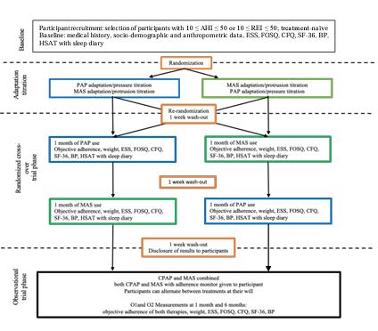 Primary outcome was objectively measured adherence (hours/night) during cross-over phase. Secondary outcomes included efficacy during cross-over phase; adherence during observational phase; patient-centered outcomes, blood pressure and side-effects during cross-over and observational phases. Duration of cross-over and observational phases were 2.5 and 6?months respectively.
