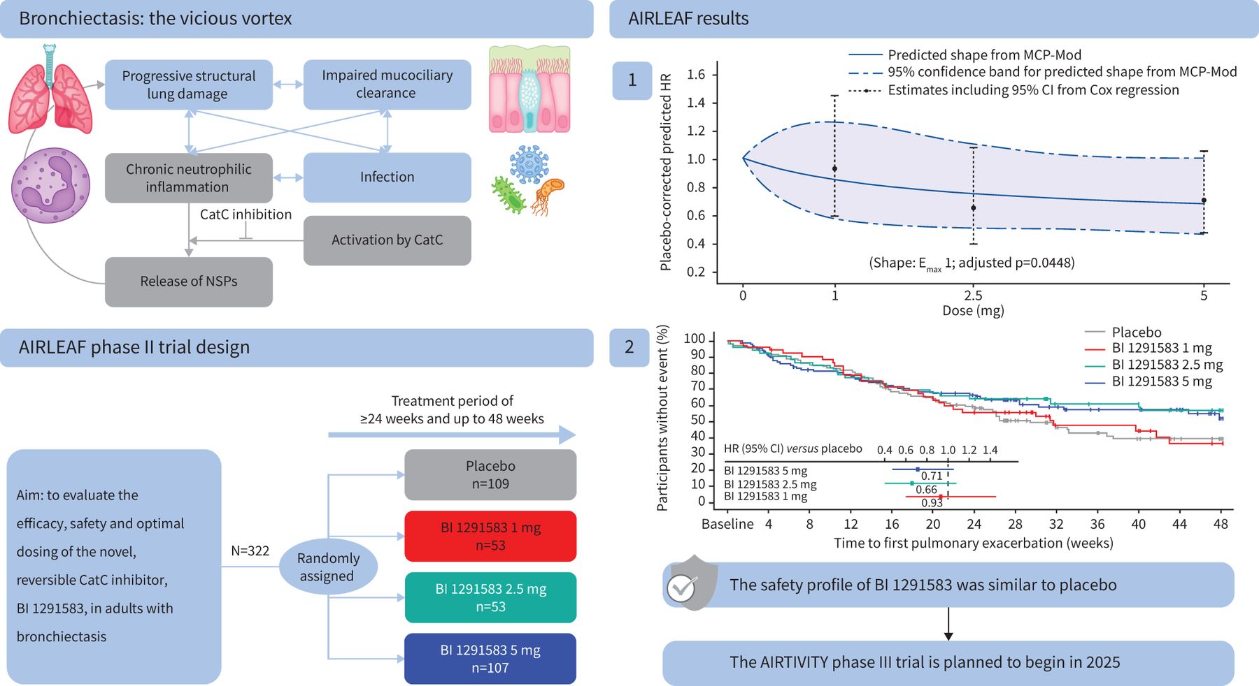Bronchiectasis is characterised by uncontrolled neutrophil serine protease (NSP) activity. Cathepsin C (CatC; dipeptidyl peptidase 1) activates NSPs during neutrophil maturation. CatC inhibitors can potentially reduce neutrophil-mediated lung damage. This phase II, randomised, double-blind, placebo-controlled trial (AIRLEAF®; clinicaltrials.gov identifier NCT05238675) evaluated efficacy, safety and optimal dosing of BI 1291583, a novel, reversible CatC inhibitor, in adults with bronchiectasis.