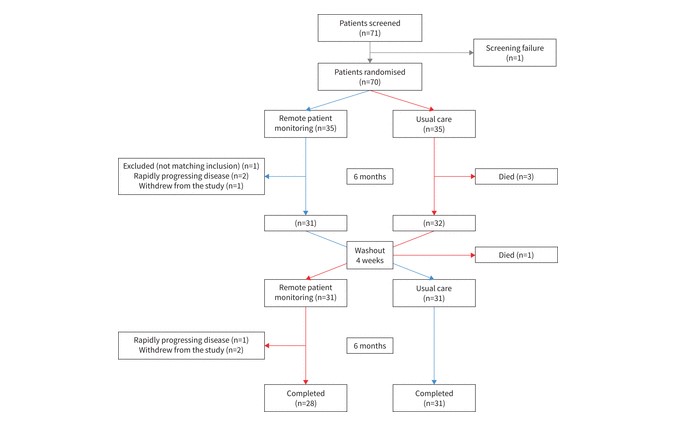 59 patients completed the study: 28 patients randomised to start with UC and 31 randomised to start with RPM. The changes in the SF-12 Physical Component Summary (PCS) (UC: ?1.17±6.90 versus RPM: ?1.06±8.15) and Mental Component Summary (MCS) (UC: 0.63±11.14 versus RPM: ?0.63±8.15), as well as in CAT, the mMRC scale, the EQ-5D, HADS anxiety, HADS depression and number of exacerbations, were similar in both intervention periods. Neither the 26-week UC period nor the intervention significantly affected the measured outcomes. There was a 95% adherence rate during RPM.