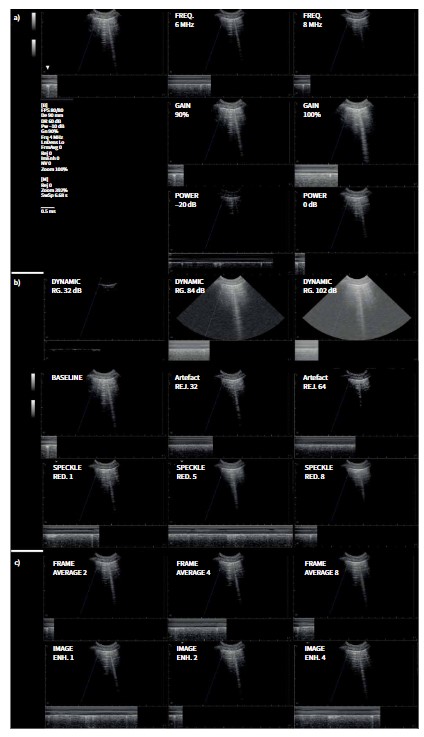 29 patients were enrolled with a median Sequential Organ Failure Assessment score of 6 (interquartile range (IQR) 3). IMV was mainly due to stroke (n=10) and pneumonia (n=6). LUS was made between days 1 and 6 (IQR). Baseline recordings showed a median of 2±2 VAs in inspiration and a median of 1±2 in expiration from a total of 3636 expert classifications, with a strong agreement within patients. A probe frequency of 8?MHz, artefact filtering, speckle reduction and frame average reduced the median VA number by one. A power of ?20?dB and dynamic range of 32?dB abolished the VAs. A gain above 90% increased the median number of VAs by one.