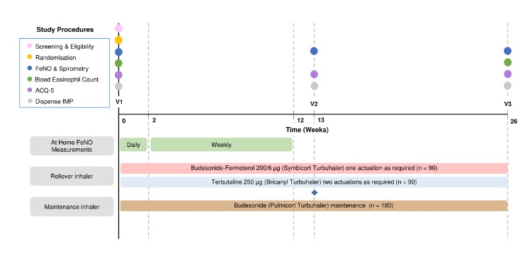 A 26-week, open-label, parallel-group, 2-arm, phase IV, two-sided superiority RCT will recruit 180 adults aged 16–75 with a clinical diagnosis of asthma using reliever only therapy, or SABA reliever therapy with maintenance ICS at baseline, and with baseline FeNO at screening ?25 ppb. Enrolled participants will be allocated to maintenance budesonide with the dose based on their baseline treatment step and randomised 1:1 to either budesonide-formoterol or terbutaline reliever therapy. All participants will perform at home FeNO measurements at regular intervals for the first 12?weeks of the study. The primary outcome is FeNO at 26?weeks. Key secondary outcomes include FeNO time-course, asthma exacerbations, asthma control and spirometry.