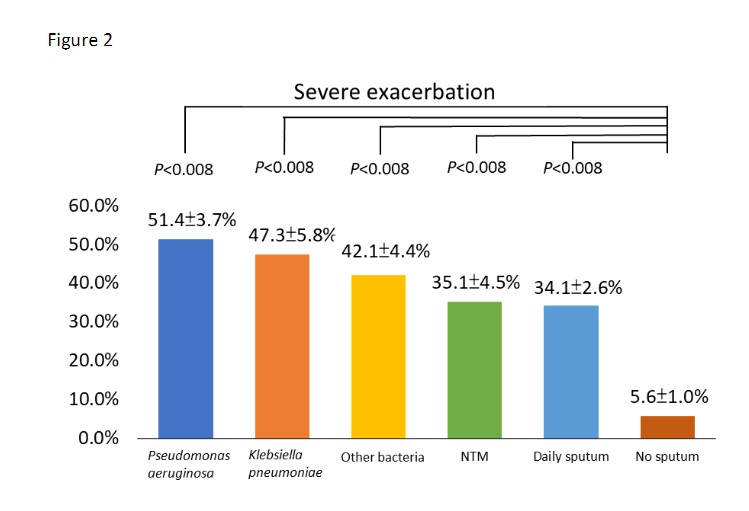 A total of 1416 patients (mean age, 67?years; males, 43%) were included. The mean modified Reiff score was 5 (range: 1–18). Fifty-nine percent (829 patients) had sputum, whereas the remaining did not. The proportions of bacteria and NTM cultured from sputum within one year of observation were 27% (381/1416) and 15% (202/1416), respectively. The most common bacterial isolate was P. aeruginosa (13%), followed by K. pneumoniae (7%). Twenty-six percent of the patients experienced severe exacerbations at least once within the year. The one-year all-cause mortality rate was 3%. Patients with sputum exhibited a higher rate of severe exacerbations compared to that in patients with dry bronchiectasis, regardless of the presence of bacteria or NTM (p<0·001). Patients with bacterial colonization had a higher mortality rate (p<0·001). Further, the highest mortality rate was observed among those with K. pneumoniae colonization (hazard ratio [HR]: 8.39, 95% confidence interval [95% CI]: 2.39–29.49), followed by individuals colonized with other bacteria (HR: 8.04, 95% CI: 2.36–27.38) and P. aeruginosa (HR: 7.83, 95% CI: 2.45–25.03). Additionally, old age was an independent risk factor (HR, 2.72; 95% CI: 1.19–6.18).