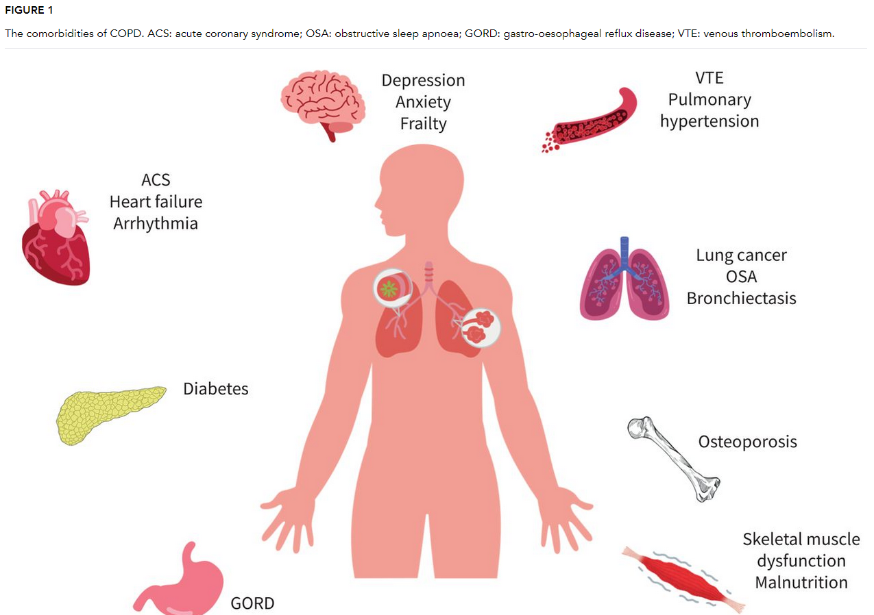 COPD is one of the most common chronic respiratory conditions and is associated with high healthcare use, morbidity and mortality. Multimorbidity in COPD is common and confers a worse prognosis. Despite this, there is delayed and often under-diagnosis of comorbid diseases in COPD. Knowledge of the respiratory and non-respiratory pathologies that can coexist with COPD is essential to ensure early detection and appropriate management. This review provides an overview of the comorbidities that have been described in COPD. We discuss their pathogenesis, pitfalls in their diagnosis, and strategies for their prevention and treatment.