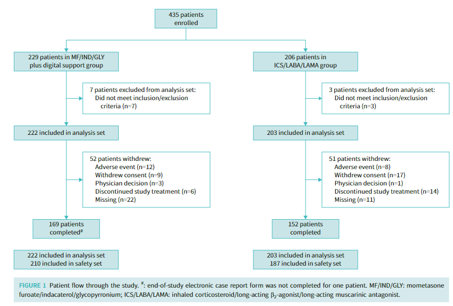 Of 222 and 203 patients in the MF/IND/GLY plus digital support and ICS/LABA/LAMA groups, 76.1% and 74.9% completed follow-up, respectively. Baseline mean ACT total scores were 17.0 and 14.7, with mean changes from baseline at 6?months of 3.0 and 4.1, respectively; following propensity matching (n=92 per group), mean changes were similar in the two groups, with overlapping 95% confidence intervals (2.9 (95% CI 1.9–3.9) and 4.0 (95% CI 3.0–5.1), respectively). At enrolment, patients were overall moderately adherent to maintenance therapy, with limited changes over the study. The overall incidence of adverse events was similar in the two groups (29.5% and 27.3% of patients, respectively).