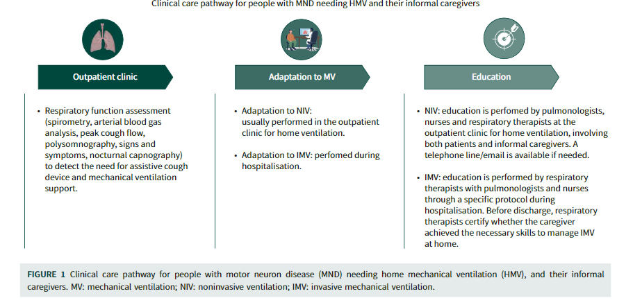 Respiratory failure represents the leading cause of death among people with motor neuron disease (MND). Home mechanical ventilation supports respiratory function, but its management places a significant demand on patients and informal caregivers. The need for consistent support to deal with home mechanical ventilation is recognised. Regardless, specific educational interventions are infrequently reported. Within its multidisciplinary clinical care pathway, the Regional Expert Centre for MND of a Northern Italy university hospital offers patients and their caregivers an educational programme on how to deal with noninvasive ventilation (NIV) and invasive mechanical ventilation (IMV) at home.