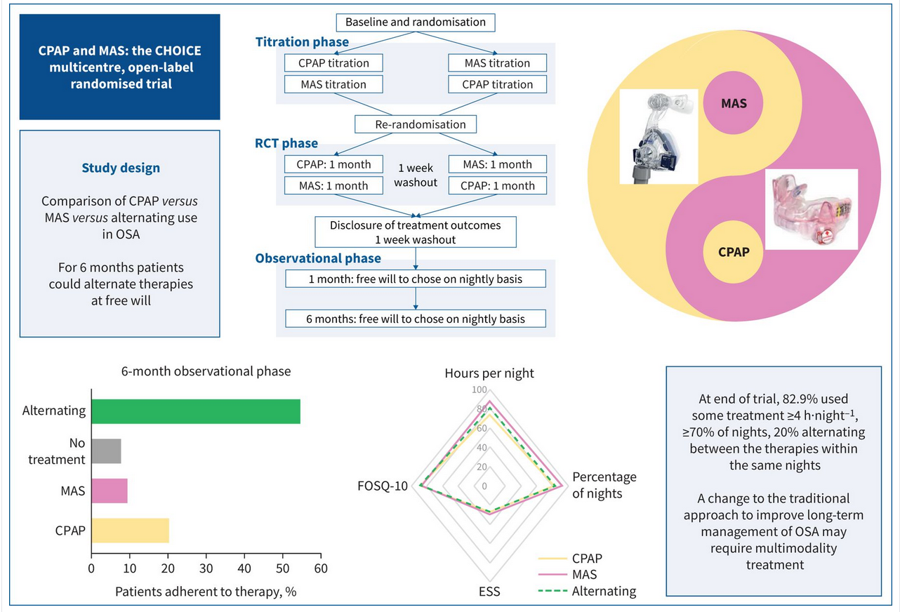 81 participants were enrolled in the first randomisation. 79 entered the adaptation/titration phase (mean±sd age 52.3±10.8?years; 58 males), 73 entered the crossover phase (included in the intention-to-treat analysis) and 64 completed the observational phase. Mean objective adherence over 1?month: MAS showed higher adherence than CPAP, 6.0 versus 5.3?h·night?1 (difference 0.7 (95% CI 0.3–1.2)?h·night?1; p<0.001). Mean CPAP?MAS difference in efficacy: 10.4 (95% CI 7.8–13.0)?events·h?1; p<0.001. During the observational phase 55% (35 out of 64) of participants chose to alternate therapies. All treatments led to substantial improvement in patient-centred outcomes.