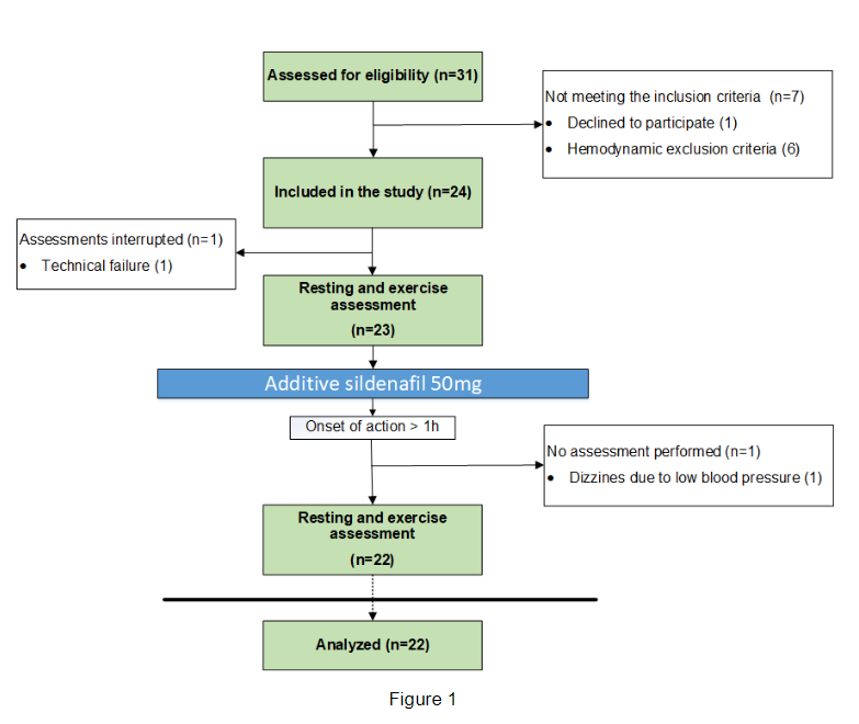 The mean systemic arterial pressure was significantly lower after additive sildenafil at rest (?9 (?13 to ?5, p<0.001)) mmHg and at end-exercise (?9(?13 to ?5, p<0.001)) mmHg. One patient experienced dizziness.