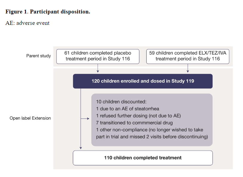 In this phase 3b extension study, dosing was based on weight and age with children weighing <30?kg and aged <12?years receiving ELX 100?mg once daily (qd), TEZ 50?mg qd, and IVA 75?mg every 12?h (q12) and children ?30?kg or ?12?years receiving ELX 200?mg qd, TEZ 100?mg qd, and IVA 150?mg q12. Primary endpoint was safety and tolerability. Secondary and other efficacy endpoints included absolute changes from parent study baseline in sweat chloride concentration, LCI2.5, ppFEV1, and CFQ-R respiratory domain score.