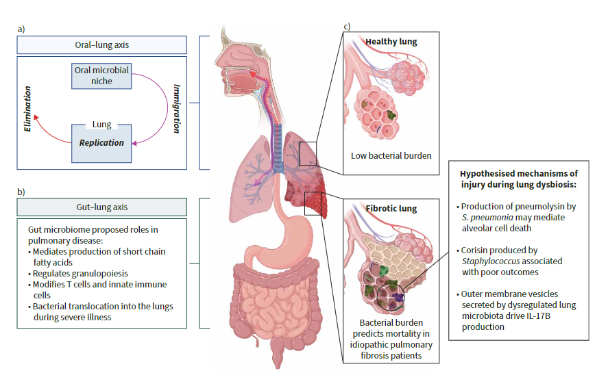 Interstitial lung disease (ILD) is a heterogeneous chronic form of lung disease. The pathogenesis of ILD is poorly understood and a common form of ILD, idiopathic pulmonary fibrosis (IPF) is associated with poor prognosis. There is evidence for substantial dysregulated immune responses in ILD. The microbiome is a key regulator of the immune response, and the lung microbiome correlates with alveolar immunity and clinical outcomes in ILD. Most observational lung microbiome studies have been conducted in patients with IPF. A consistent observation in these studies is that the bacterial burden of the lung is elevated in patients with IPF and predicts mortality. However, our understanding of the mechanism is incomplete and our understanding of the role of the lung microbiome in other forms of ILD is limited. The microbiomes of the oropharynx and gut may have implications for the lung microbiome and pulmonary immunity in ILD but require substantial further research. Here, we discuss the studies supporting a role for the lung microbiome in the pathogenesis of IPF, and briefly describe the putative role of the oral–lung axis and the gut–lung axis in ILD.
