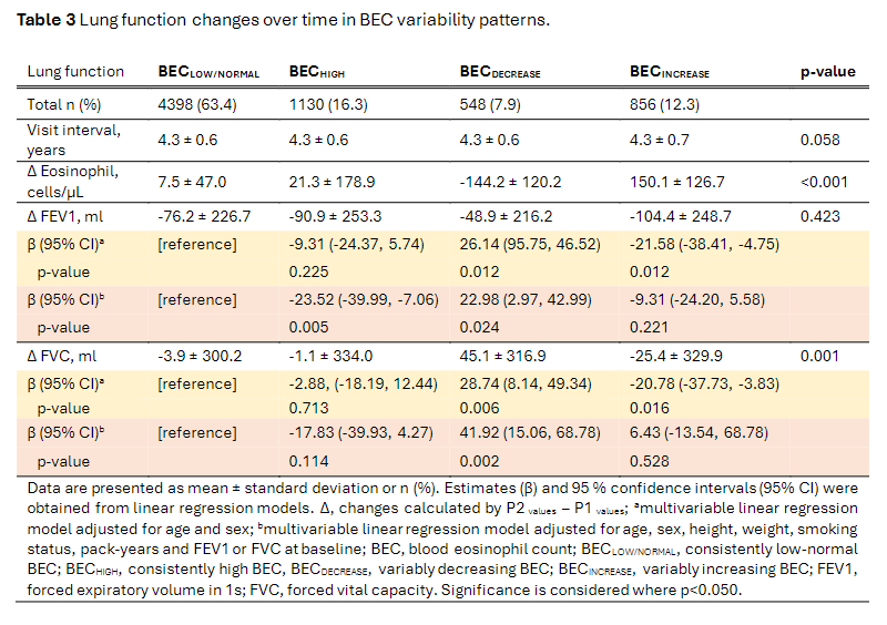 Most individuals remain within their baseline BEC threshold (83.7% in BECLOW/NORMAL and 67.3% in BECHIGH). BEC variability exceeded the normal range (?30 to 60?cells·µL?1) BECINCREASE (+150?cells·µL?1) and BECDECREASE (?144?cells·µL?1) groups. BEC variability significantly affected lung function (?FEV1- BECDECREASE, 26.14 (95.75, 46.52) and BECINCREASE, ?21.58 (?38.41, ?4.75); and ?FVC- BECDECREASE, 28.74 (8.14, 49.34) and BECINCREASE, ?20.78 (?37.73, ?3.83)). BECHIGH individuals were most associated with respiratory symptoms.