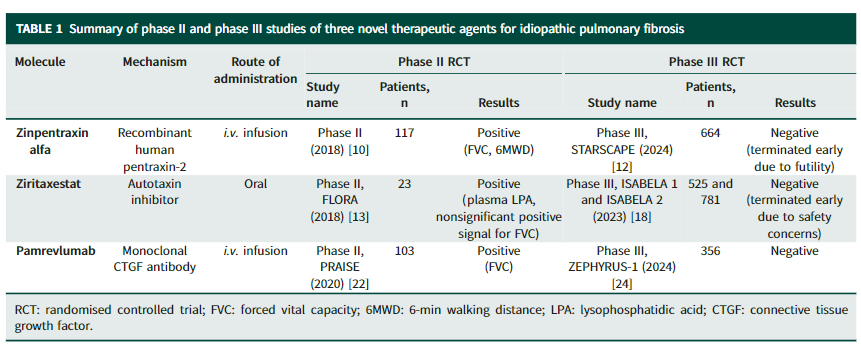We examine three pivotal trials of novel IPF therapies, zinpentraxin alfa, ziritaxestat and pamrevlumab, that failed in late-stage clinical development. These failures underscore common pitfalls in IPF drug development, including inadequate phase II sample sizes, reliance on surrogate endpoints like forced vital capacity, and challenges integrating background antifibrotic therapies.