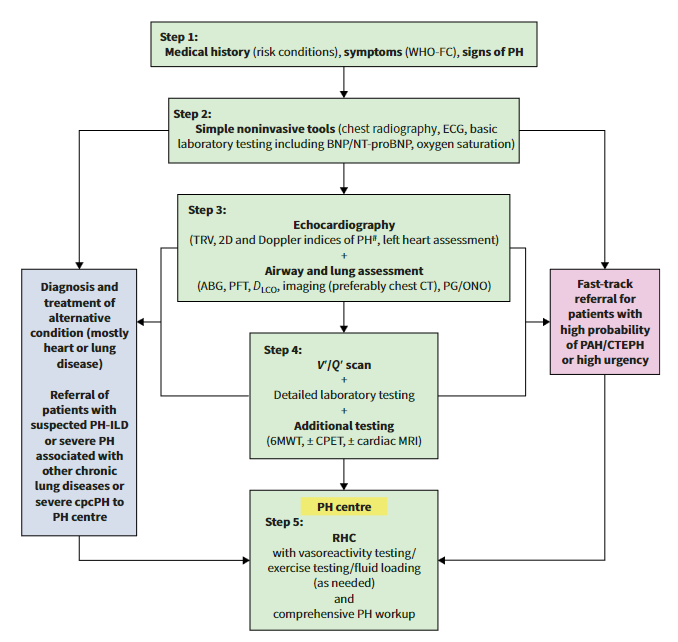 Pulmonary hypertension (PH) is a haemodynamic condition characterised by elevation of mean pulmonary arterial pressure (mPAP) >20?mmHg, assessed by right heart catheterisation. Pulmonary arterial wedge pressure (PAWP) and pulmonary vascular resistance (PVR) distinguish pre-capillary PH (PAWP ?15?mmHg, PVR >2?Wood Units (WU)), isolated post-capillary PH (PAWP >15?mmHg, PVR ?2?WU) and combined post- and pre-capillary PH (PAWP >15?mmHg, PVR >2?WU). Exercise PH is a haemodynamic condition describing a normal mPAP at rest with an abnormal increase of mPAP during exercise, defined as a mPAP/cardiac output slope >3?mmHg/L/min between rest and exercise. The core structure of the clinical classification of PH has been retained, including the five major groups. However, some changes are presented herewith, such as the re-introduction of “long-term responders to calcium channel blockers” as a subgroup of idiopathic pulmonary arterial hypertension, the addition of subgroups in group 2 PH and the differentiation of group 3 PH subgroups based on pulmonary diseases instead of functional abnormalities. Mitomycin-C and carfilzomib have been added to the list of drugs with “definite association” with PAH. For diagnosis of PH, we propose a stepwise approach with the main aim of discerning those patients who need to be referred to a PH centre and who should undergo invasive haemodynamic assessment. In case of high probability of severe pulmonary vascular disease, especially if there are signs of right heart failure, a fast-track referral to a PH centre is recommended at any point during the clinical workup.