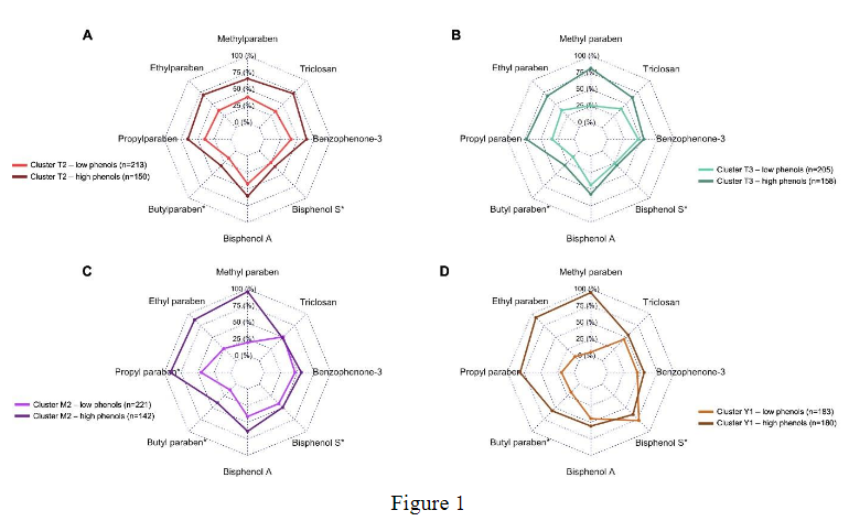 Two exposure profiles were identified at each point in time, characterized by low versus high levels of several phenol compounds. Overall, high exposure profiles were associated with altered oscillometry parameters at 3 years, particularly between high exposure profile at T2 and higher frequency-dependence of resistance (R7–19) and lower volume-dependence of reactance (ΔX); high exposure profile at M2 and lower reactance at 7 Hz (X7), and high exposure at Y1 and higher area of the reactance curve (AX), resistance at 7 Hz (R7), and volume-dependence of resistance (ΔR).