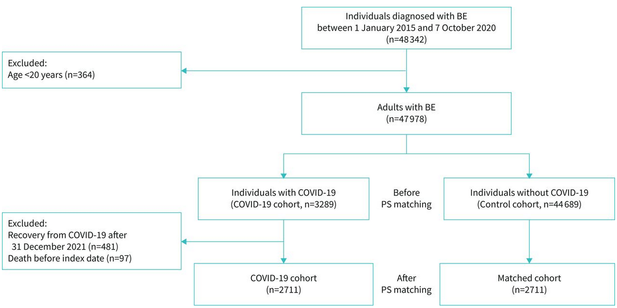 We enrolled 48 342 individuals diagnosed with bronchiectasis between 1 January 2015 and 7 October 2020 from Korea National Health Insurance Service. Of these individuals, 2711 with bronchiectasis were identified as also having recovered from COVID-19. A COVID-19 and matched cohort (n=2711 for both) were established after 1:1 propensity matching. The exposure was COVID-19 (non-severe and severe), and outcomes were severe exacerbation of bronchiectasis and death following the COVID-19 recovery date.