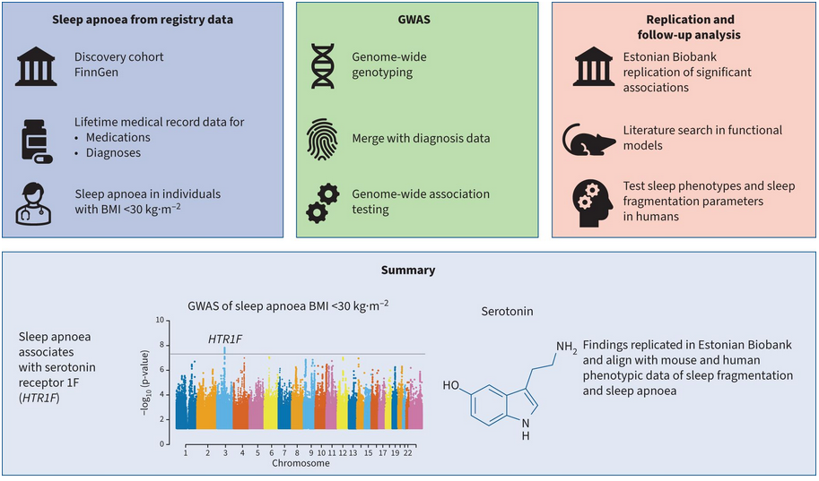 The findings indicate that HTR1F is associated with sleep apnoea, particularly in the non-obese patient population, and provide insight into the growing evidence of serotonin signalling as a factor modulating liability to sleep apnoea.