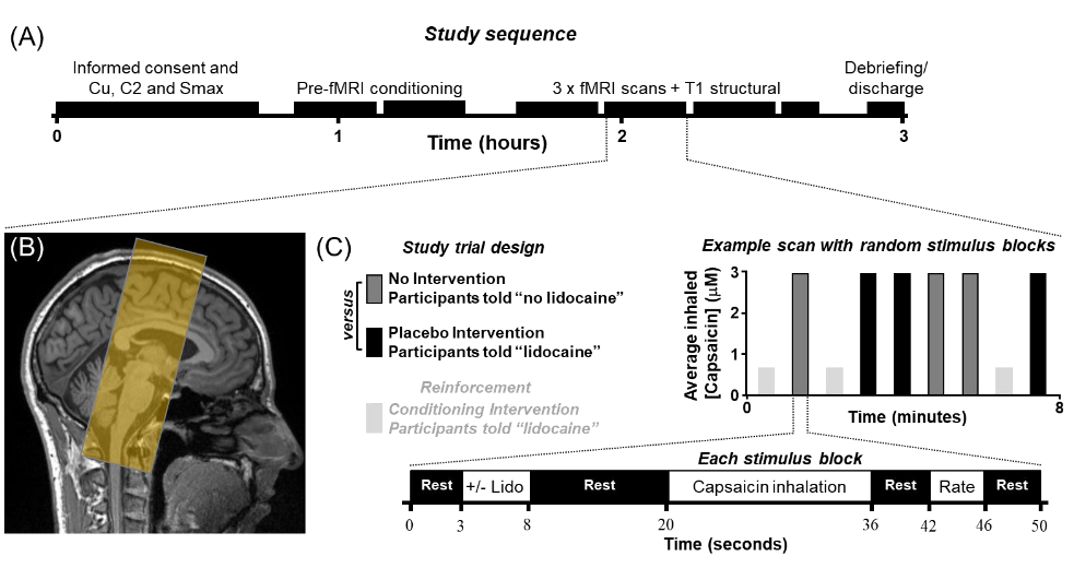 Using an expectation-dependent placebo induction design during blood oxygen level-dependent (BOLD) functional magnetic resonance imaging (fMRI) optimised for quantifying brainstem activity, we compared regional brainstem responses evoked by capsaicin inhalation in sixteen healthy individuals during No Intervention versus Placebo Intervention trials.