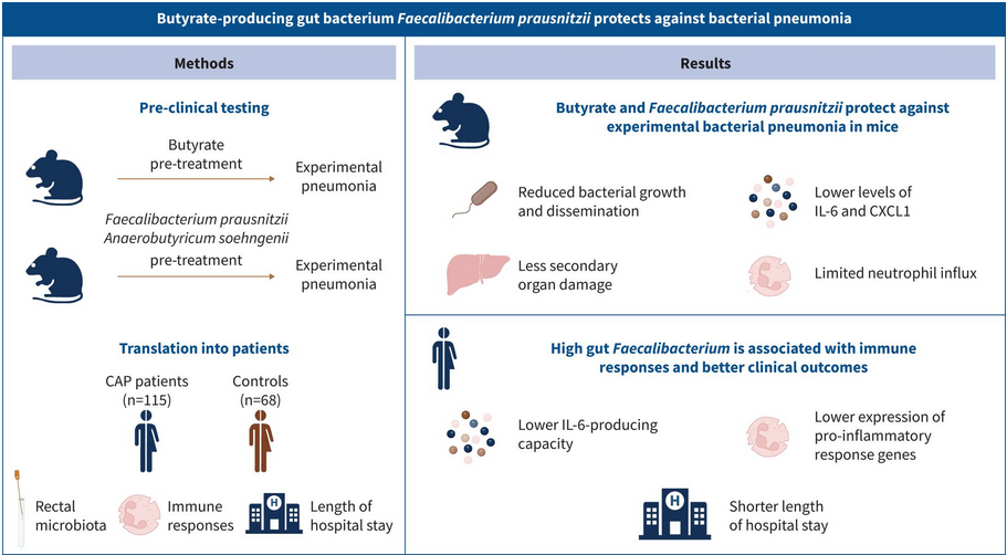 Pre-treatment with F. prausnitzii, but not A. soehngenii, protected mice against bacterial pneumonia, as reflected by reduced bacterial growth and dissemination, lessened organ damage, and dampened inflammation. Similar to butyrate pre-treatment, F. prausnitzii resulted in reduced pulmonary interleukin (IL)-6 and CXCL1. In humans, gut Faecalibacterium was decreased during CAP compared to matched controls. CAP patients with higher gut Faecalibacterium levels had lower IL-6-producing capacity and downregulated inflammatory gene expression. Higher intestinal Faecalibacterium levels were associated with better clinical outcomes in independent cohorts of CAP and critically ill patients, which remained significant when controlled for potential confounders.