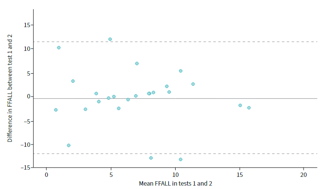 Neither age, gender, height, body mass index, atopy, nor baseline FEV1 affected the responses statistically significantly. The mean±sd FFALL was 5.29±4.90% with an upper limit of 13.4%. The mean±sd RDR was 0.78±0.71% per 100 mg with an upper limit of 1.96% per 100 mg. In the repeated tests, the intraclass correlation coefficients were 0.46 and 0.35, respectively.
